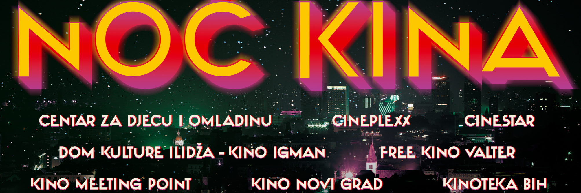 Na Noć kina, 27. decembra, od 17 sati do ponoći, besplatno uživajte u filmovima i posjetite: Centar za djecu i omladinu, Cineplexx, CineStar, Dom kulture Ilidža – Kino Igman, Free kino Valter, kino Meeting Point, kino Novi Grad i Kinoteku BiH. Noć kina postaje tradicija i u Sarajevu, gradu koji je zvanično proglašen gradom filma UNESCO-a 2019. godine.