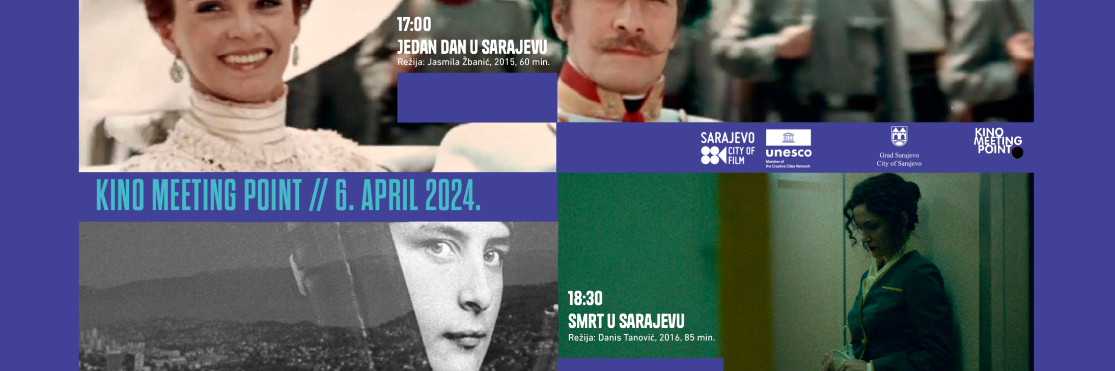 U kinu Meeting Point u Sarajevu u subotu, 6. aprila bit će prikazana tri filma, uz besplatan ulaz za sve posjetitelje: u 17 sati na programu je film Jasmile Žbanić „Jedan dan u Sarajevu“; u 18.30 sati film Danisa Tanovića „Smrt u Sarajevu“ (2016, 85 min.) i u 20.30 sati omnibus „Mostovi Sarajeva“