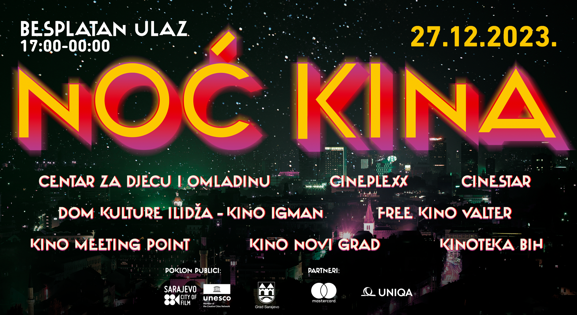 Na Noć kina, 27. decembra, od 17 sati do ponoći, besplatno uživajte u filmovima i posjetite: Centar za djecu i omladinu, Cineplexx, CineStar, Dom kulture Ilidža - Kino Igman, Free kino Valter, kino Meeting Point, kino Novi Grad i Kinoteku BiH. Noć kina postaje tradicija i u Sarajevu, gradu koji je zvanično proglašen gradom filma UNESCO-a 2019. godine.